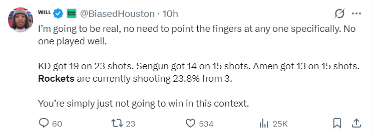 休媒Will写道:说实话没必要将责任归咎于某个球员,因为大家都打得不好,KD23投19分,申京15投14分,阿门15投13分,火箭三分命中率23.8%,这样的情况下火箭不可能赢球。