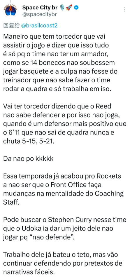 另一欧洲的休媒写道:很多火箭球迷认为本赛季火箭表现不佳是因为没有控球后卫,好像全队不会打球都要归结于没有PG。
