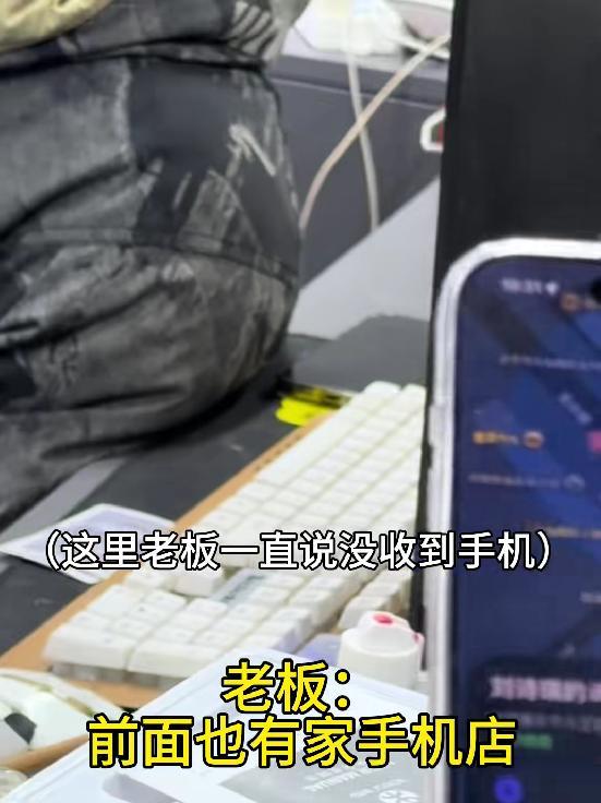 老板坐在店里玩手机,刘女士问是否有人来卖橙色的手机,老板表示没有,还说前方还有家手机店。